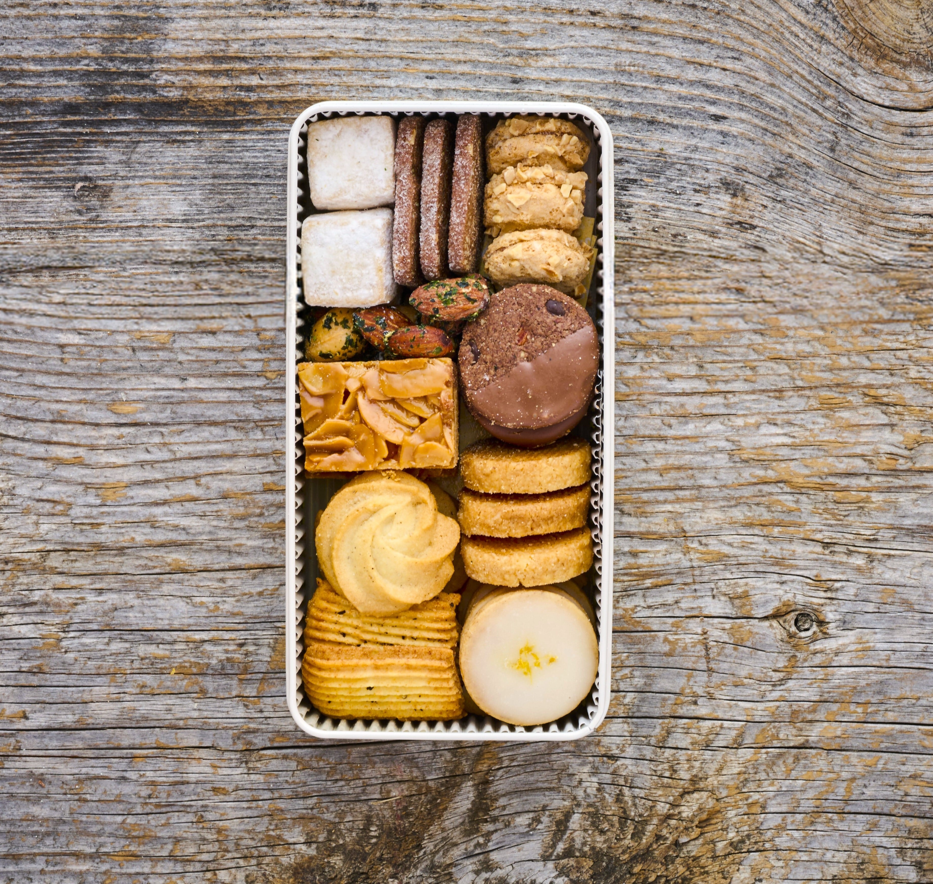 素材や味、食感にこだわった10種のクッキー&ナッツをオリジナルデザインの缶に詰めてお届けします。
